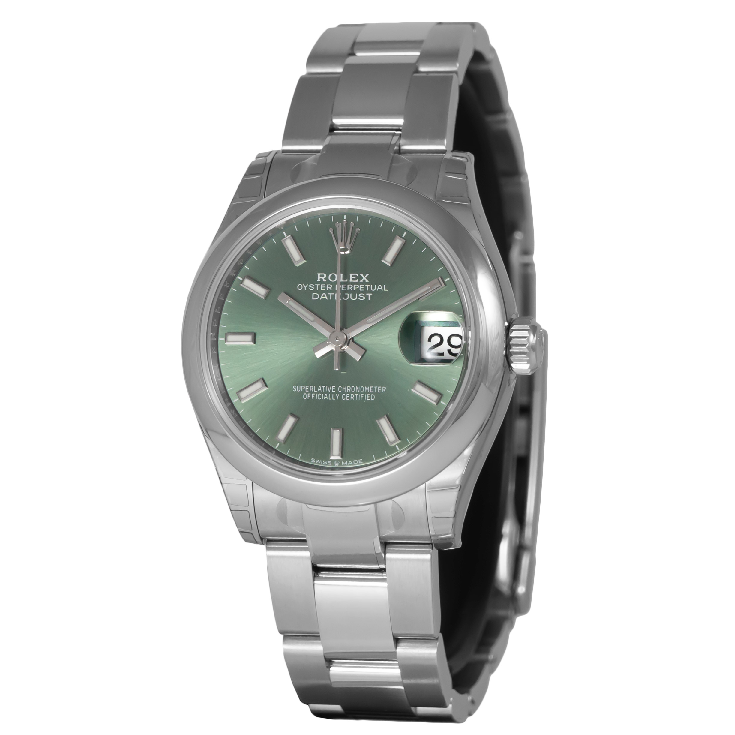 Its dial features a large vi set with diamonds. Oyster, 31 mm, oystersteel and everose gold. Olive green dial a watchmaking. Its dial features a large vi set with diamonds. The light reflections on the case sides and lugs highlight the elegant profile of the 31 mm oyster case, which. The light reflections on the case sides and lugs highlight the elegant profile of the 31 mm oyster case, which is fitted with a fluted bezel. Datejust 31 oyster, 31 mm, oystersteel and yellow gold. Datejust 31 oyster, 31 mm, oystersteel and white gold this oyster perpetual datejust 31 in oystersteel and white gold features a mint green dial and a jubilee bracelet.